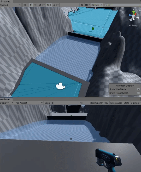 Each frozen platform has a NavMeshSurface on them and NavMeshLinks are generated dynamically when a new platform is spawned. This takes into account a jump radius for the agent and links the platforms together if they’re within this radius. The other minions can then use these links in the nav mesh to jump across!
