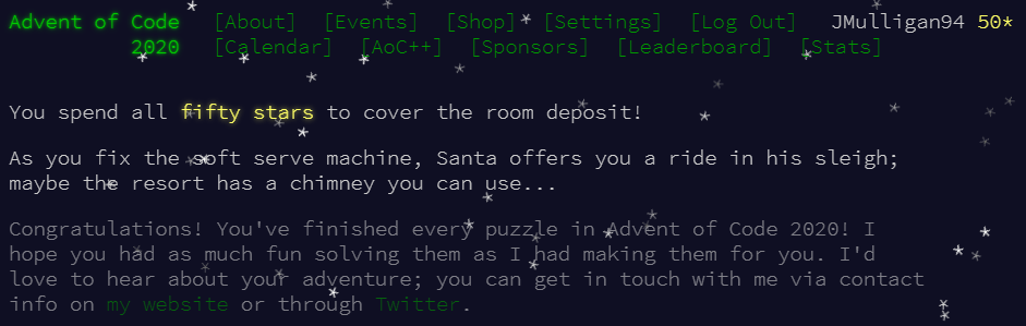Last month I took part in another challenge I was unfamiliar with – Advent of Code, created by Eric Wastl. This was another yearly challenge that serves as an advent calendar, but instead of delicious chocolate, you get a 2-part coding challenge every day from 1st – 25th December.
